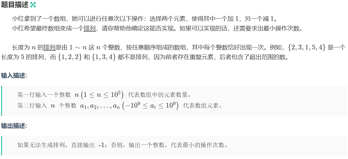 接着对输入的数组进行排序,再从1~n和数组逐一相减,由于两者和相等,因此相减之和为0,我们只需要取其中正数和即可,正数和就是最小操作次数