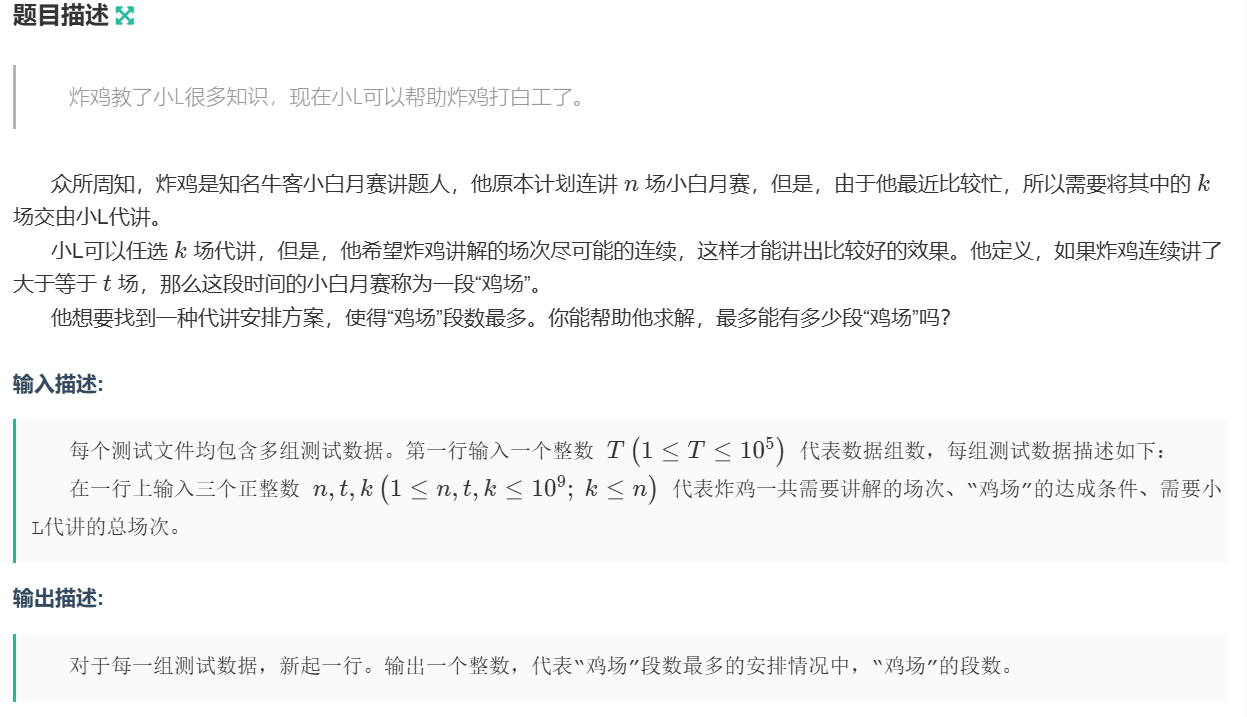 这是这道题的主要思路,有特判,当t+k > n 时,形成不了鸡场,为0