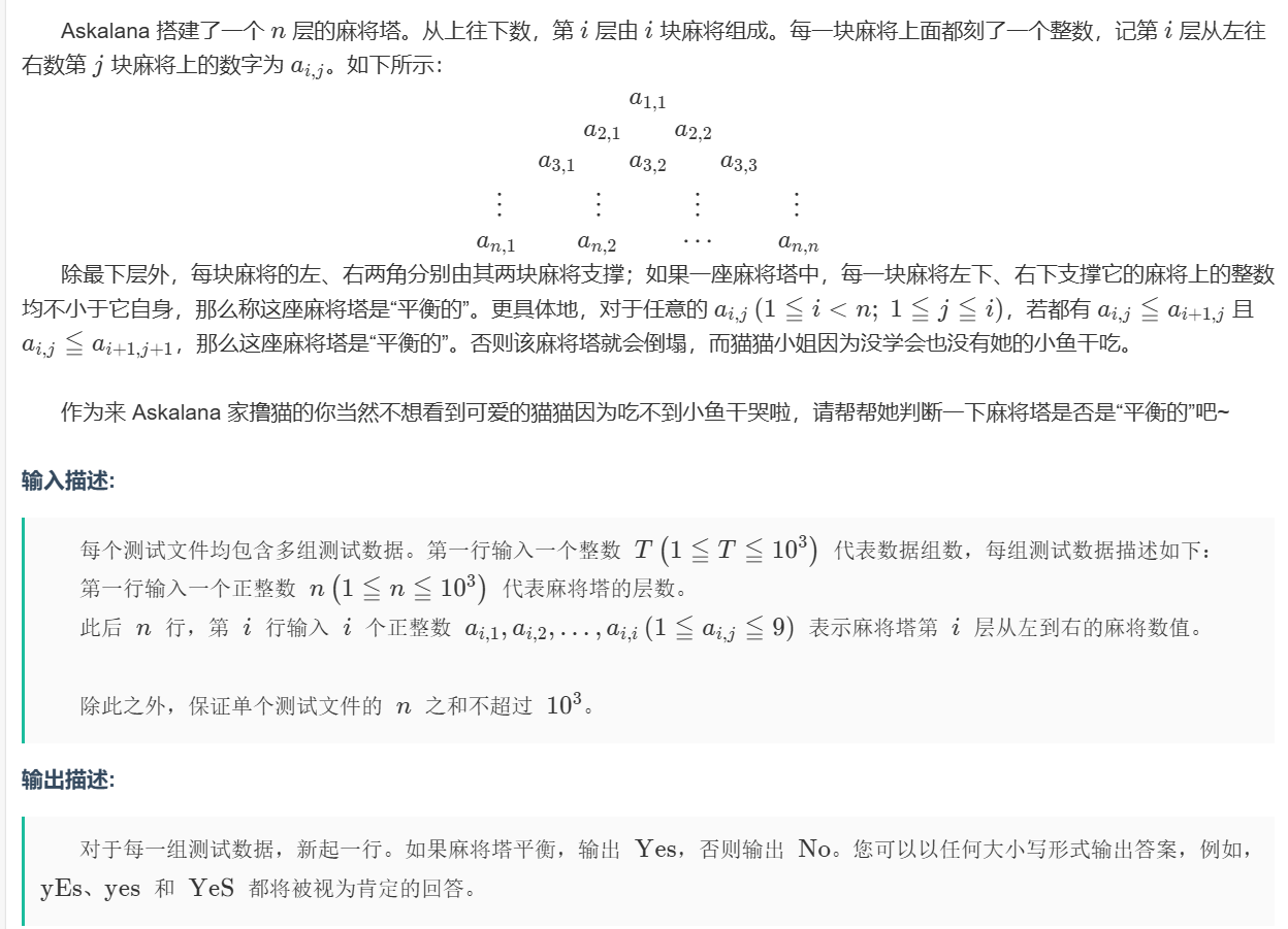 如果某个节点满足G[i][j] > G[i+1][j] || G[i][j] > G[i+1][j+1]则不行