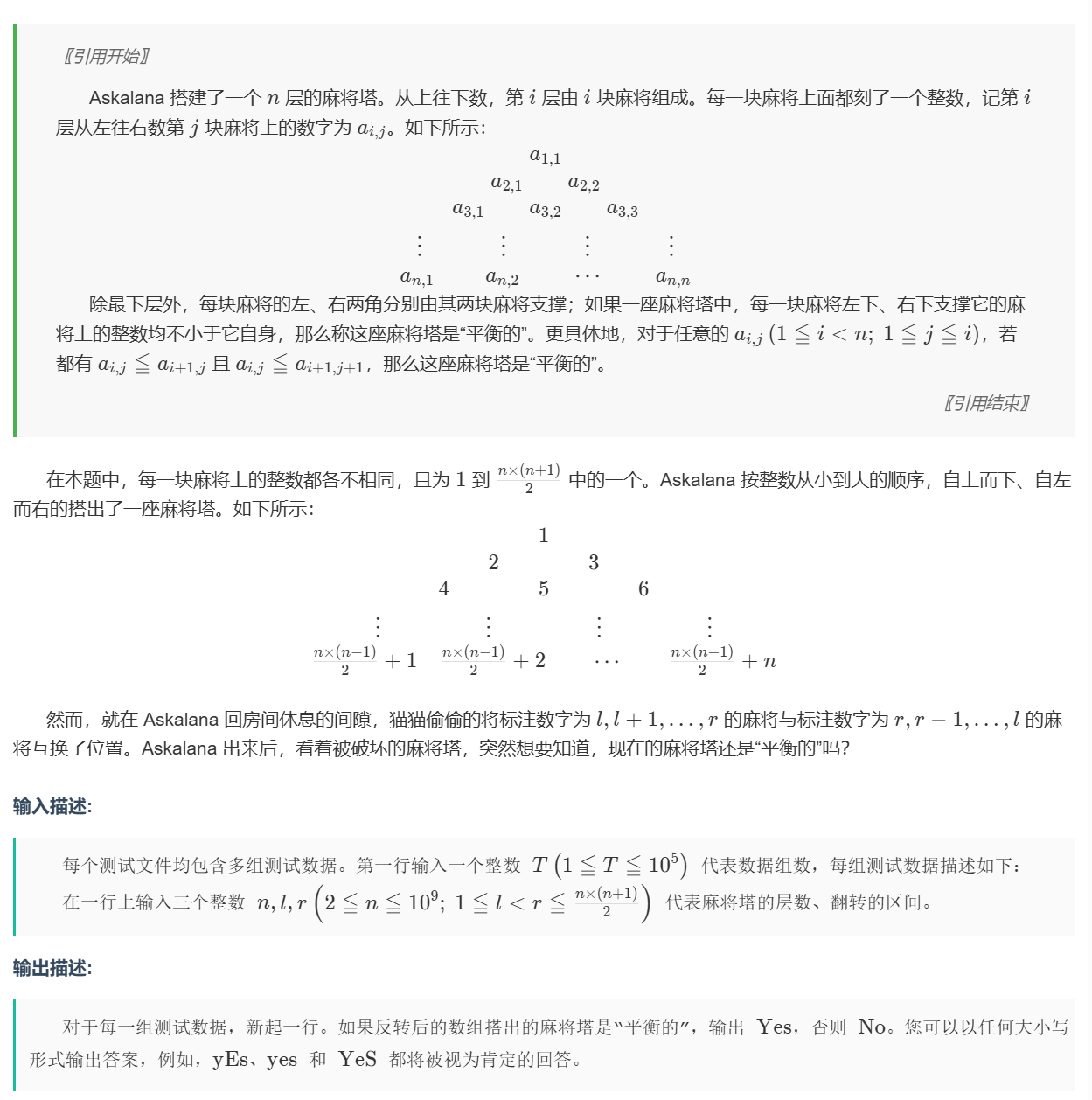 本题应用二分找到 l 和 r 的层数,如果 l 和 r 在同一层,那么颠倒后一样平衡。容易想不到的是 l 和 r 在相邻层,且 l + i(层数) > r 时同样平衡
