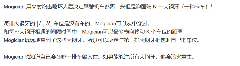 考虑上一排怎么到下一排去,假设下一排的无车区间是[L,R],那么能成功从上一排到下一排的位置是[L-K,R+K]