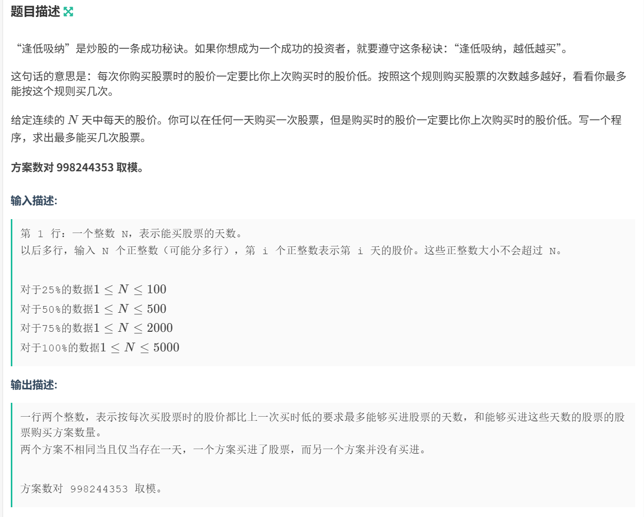 最长下降子序列,这题还加了一个方案数,会比基础dp麻烦一些,和B题一样,也要注意取模