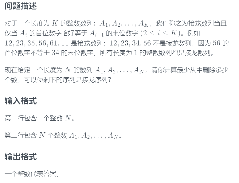 求最少要删的数的个数,直接求不好求,转换思维,求最长的序列,n减去最长的序列就是最少要删的数的个数。