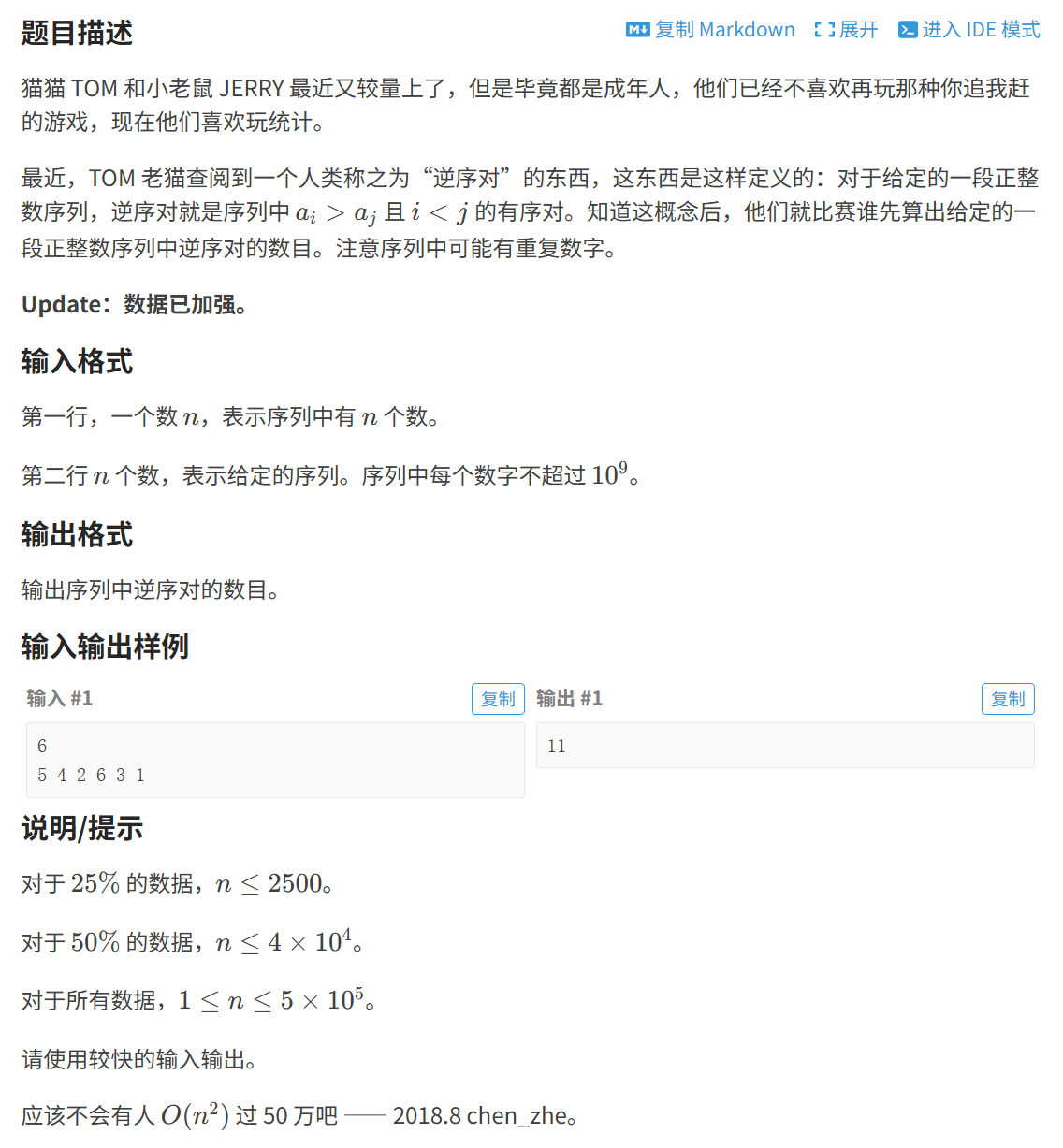 最简单的求逆序对的方法:冒泡排序,时间复杂度$ O(n^2) $