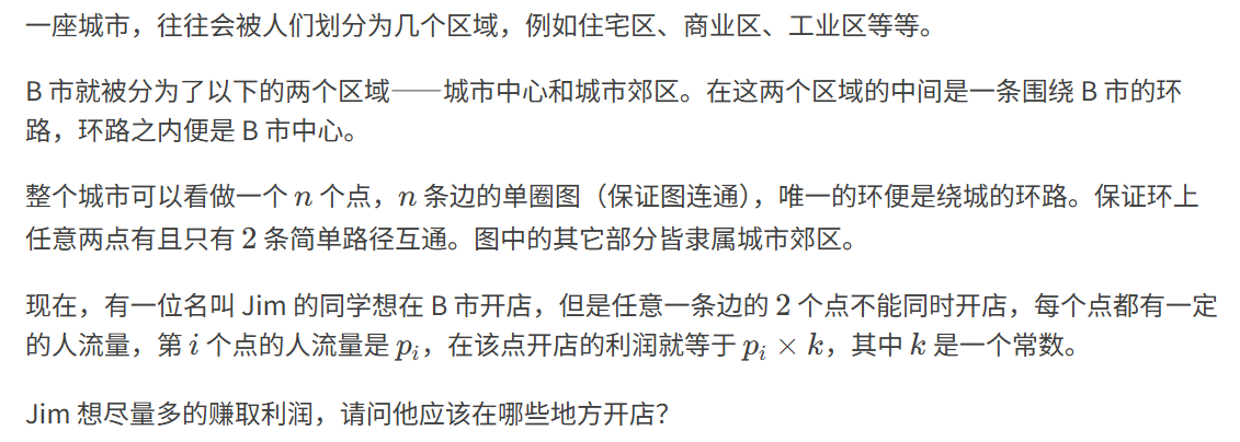 基环树用拓扑排序来找到环上一条边,也就是两个点,然后断开这条边,分别以两个点为根进行树上DP,求出最大值