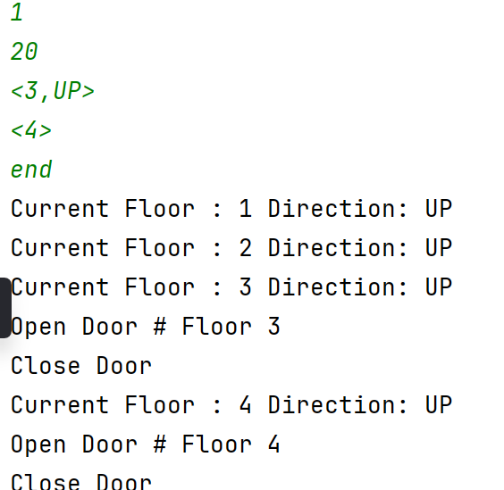 踩坑心得:在第一次编写代码的时候,没有理清题意就着急动手。花了很长时间去完成一个错误地题目,错误地理解成电梯的运行过程是按照平时生活的按电梯的模式进行运行。后来老师在课堂上对这个题目再次进行解释地时候自己也是大为震惊,辛辛苦苦写了那么多竟然是错误的,只好从头再来。这也让我自己明白了心急吃不了热豆腐。关于这个要读懂题意的踩坑心得,我以这部分代码作为参考: