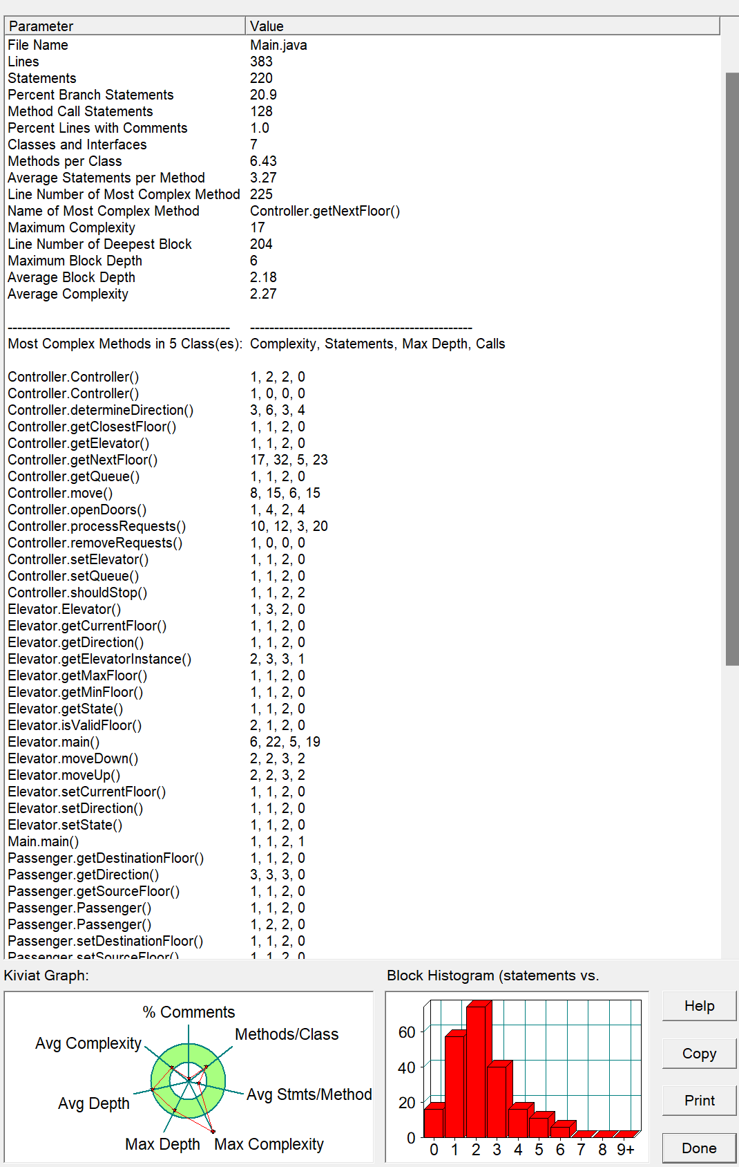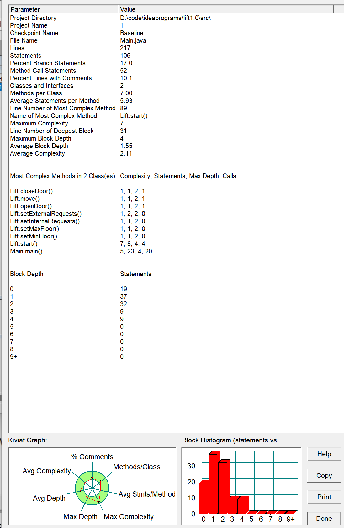 优点是整体的复杂度较低,有利于理解以及后续的维护,对于出现的一些问题也可以更快速进行排查。缺点便是可以看到这个代码的最大复杂度为7,有些高,说明Lift.start()方法的方法逻辑相对复杂,在一定程度上可以进行拆解以及优化。最复杂方法行数为89,在复杂度偏高的同时行数也偏多,理解起来会相应的比较困难,这也是缺点之一。此外,注释行占比偏低,说明在代码中的注释比较少,在代码后期进行维护和修改的时候可能会形成较大的困扰。