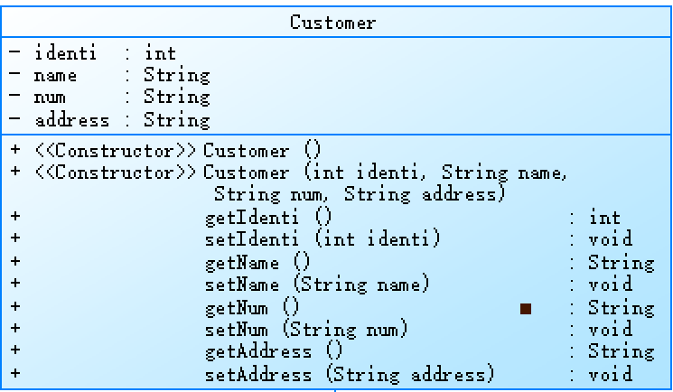 对于客户类,有姓名,电话,编号,地址四个属性,然后相应的有构造方法和get,set方法。如类图所示: