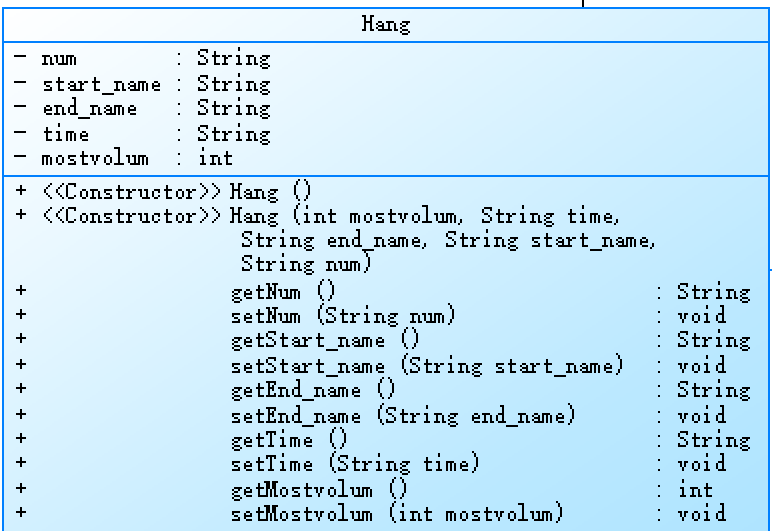 对于航班类,有航班号,起飞机场,降落机场,最大载重量,航班日期,然后相应的构造方法和get,set方法。如类图所示: