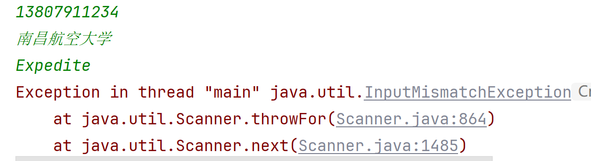 如图所示,当时纠结了好久,连输入都还没有结束,怎么就给我停止了。后来发现是11位的电话号码超出了int型的范围了。然后把int型改为String型就解决了这个问题。还有一个就是在输入整型和字符串中间,一开始没有消耗换行符,就会出现下面这种情况: