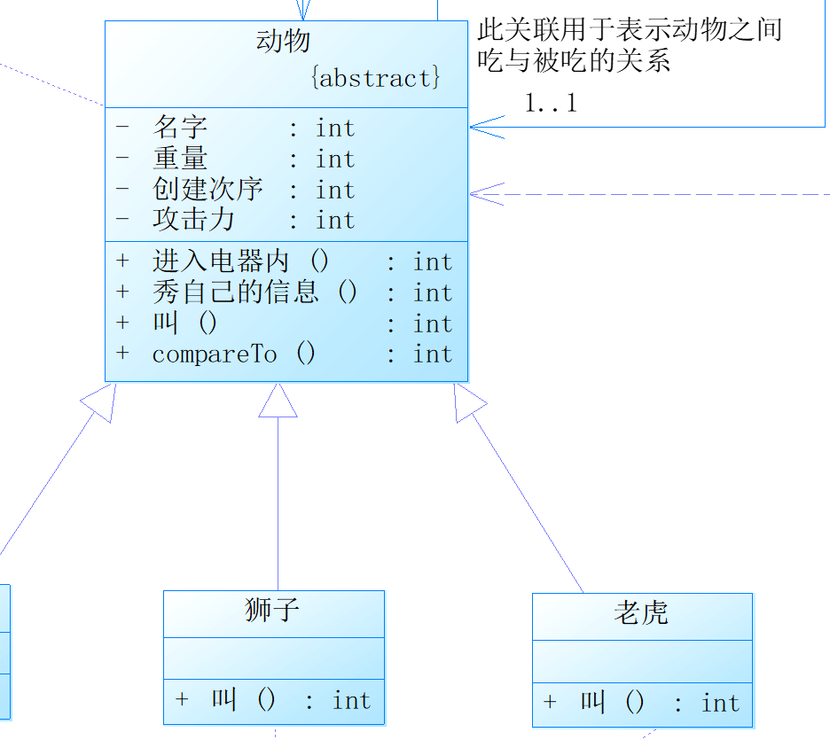 举例的类图中,“叫”这个方法比较特殊,因为方法要知道是什么动物才知道怎么叫,所以这里引入了抽象类。我们还是把“叫”这个方法放在了父类中,但是把这个方法定义为了抽象方法,即让子类去具体实现,因为有了抽象方法,所以这个类也就是抽象类了。称为抽象类之后,和普通类就有些区别了,抽象类不能够创建实例。上面提到类之间的关系还有一种是实现,即接口的实现,当一个抽象类里面没有属性的时候,我们也可以把它做成一个接口,让子类去实现这个接口。
