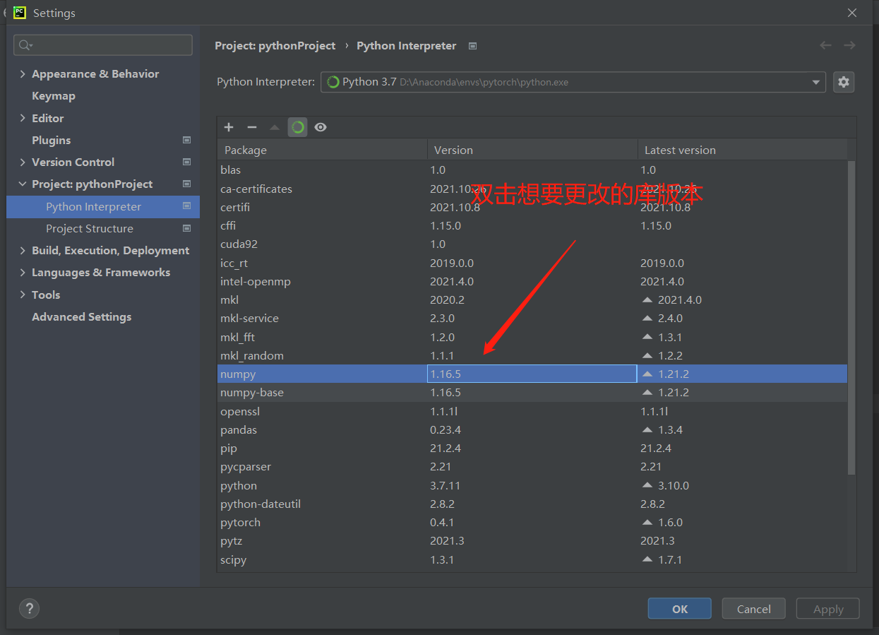 可视化安装方法:有一个很方便的方法是在Anaconda中进行安装,在PyCharm中选择更改版本