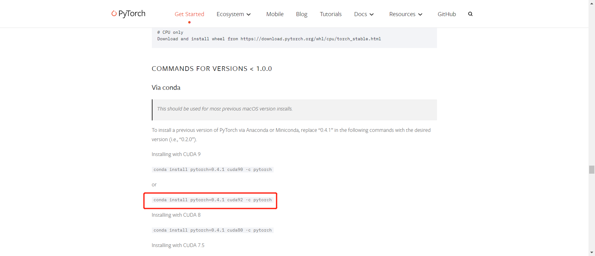 以我想要安装0.4.1版本为例,点击进入旧版本,我使用cuda9.2版本,复制后进入到指定环境安装(一定要注意激活,不要安装到base里面去了)
