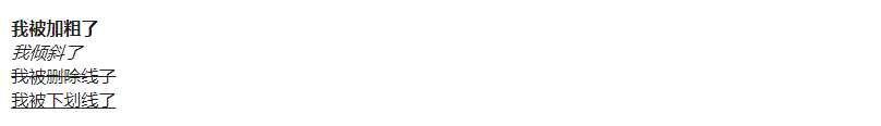 **我被加粗了** *我倾斜了* ~~我被删除线了~~ <u>我被下划线了</u>