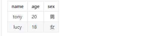#第一行为表头,第二行必须得有代表对齐格式 #分别为居中:-: 左对齐:- 右对齐-: (-无所谓多少,可以多添加方便观看) name | age | sex :-:|:-|-: tony | 20| 男 lucy | 18| 女