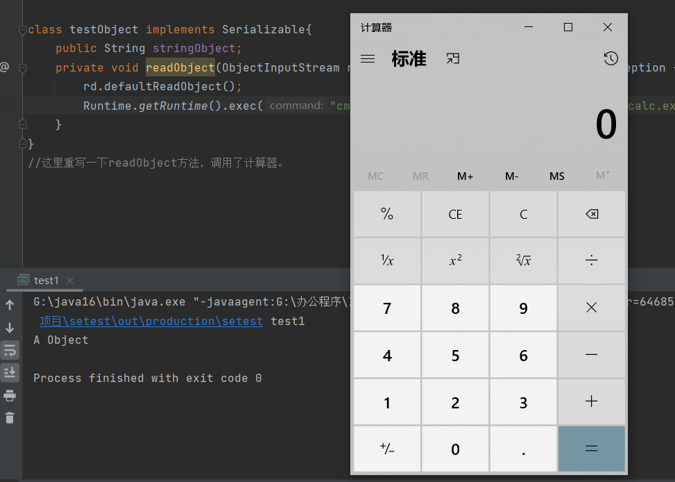 import java.io.*; public class test1 { public static void main(String[] args) throws IOException, ClassNotFoundException { testObject test = new testObject(); test.stringObject = "A Object"; //创建几个用于序列化的对象 FileOutputStream fos = new FileOutputStream("object"); ObjectOutputStream os = new ObjectOutputStream(fos); //创建一个用于存储对象的文件 os.writeObject(test); //存进去 os.close(); //关掉 FileInputStream fos2 = new FileInputStream("object"); ObjectInputStream os2 = new ObjectInputStream(fos2); //读取文件流 testObject obj2 = (testObject)os2.readObject(); System.out.println(obj2.stringObject); os2.close(); } } class testObject implements Serializable{ public String stringObject; private void readObject(ObjectInputStream rd) throws IOException, ClassNotFoundException { rd.defaultReadObject(); Runtime.getRuntime().exec("cmd /c start C:\\\\WINDOWS\\\\system32\\\\calc.exe"); } } //这里重写一下readObject方法,调用了计算器。