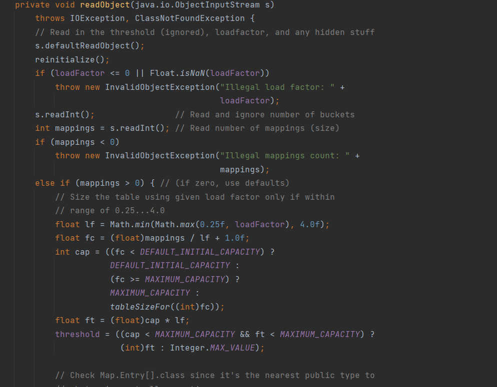 然后我们改写了readObject()方法,这个方法在反序列化时候会被调用。(具体说就是在读取字节序列时候,将他们反序列化为一个对象就是readObject的作用。)