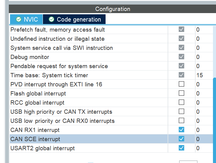 C8T6System Core配置同上位机端,开USART1(连接ZigBee模块)和CAN(连接其他单片机)DMA、NVIC。