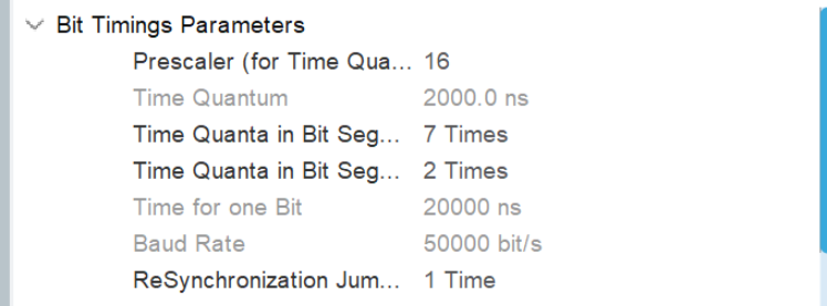 CAN的配置和默认相比,改了Time Quanta in Bit Segment 1/2(简称BS1或BS2) 为7 Times/2Times。