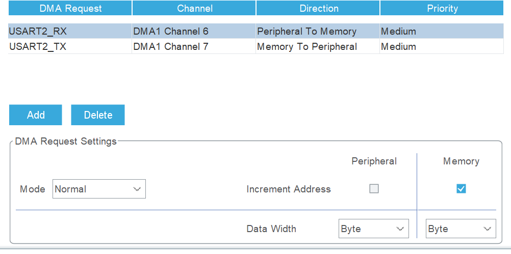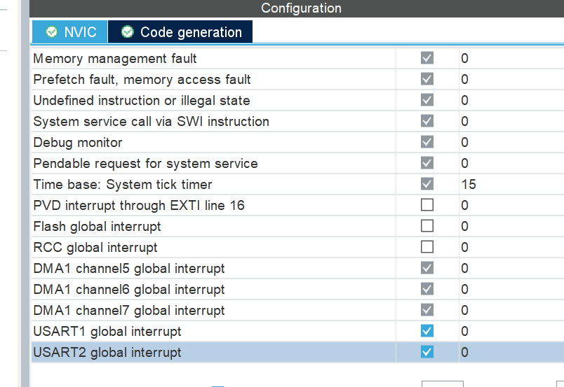 NVIC配置,勾选USART1 global interrupt和USART2 global interrupt。