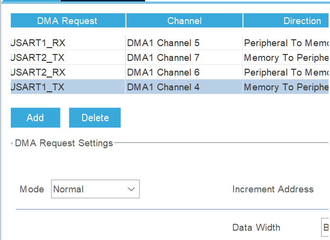 Connectivity里配置USART1(与电脑通信)和USART2(与ZigBee模块通信),System Core 再配置DMA(或者从串口的界面可以直接跳转到配置DMA的界面),配置均默认。