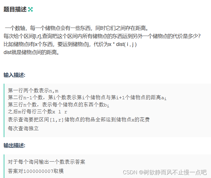 让sa下标从i=2开始,表示第i-1到第i个储物点的距离,i=2时就是第1个储物点到第2个储物点的距离。那么对于[L,R]区间内的每个j,有cost=b[j]*abs(sa[j]-sa[x])。