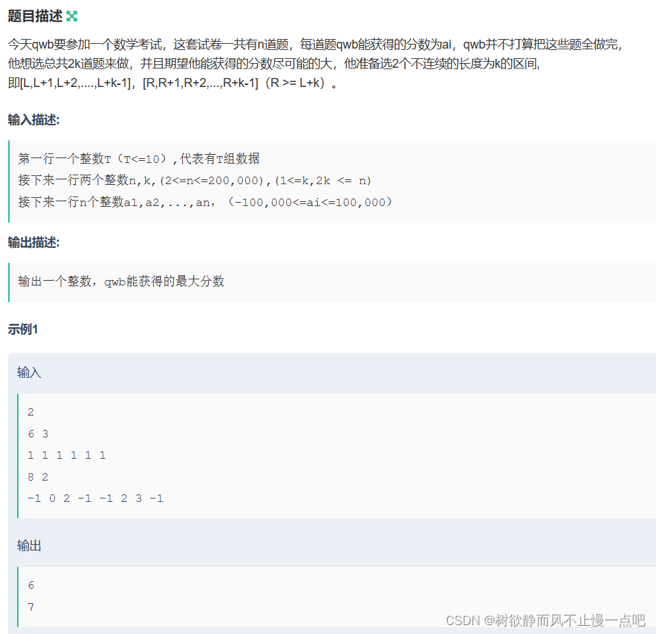 其实有O(n)的解法,毕竟有了前缀和,求区间和时间复杂度都是O(1),那直接开一个循环,找最大值和它后面的极大值,且它们两个没有重叠部分就好了。然而通过率33.3%。。。其他超时。max函数很慢吗?还是1e5太大?