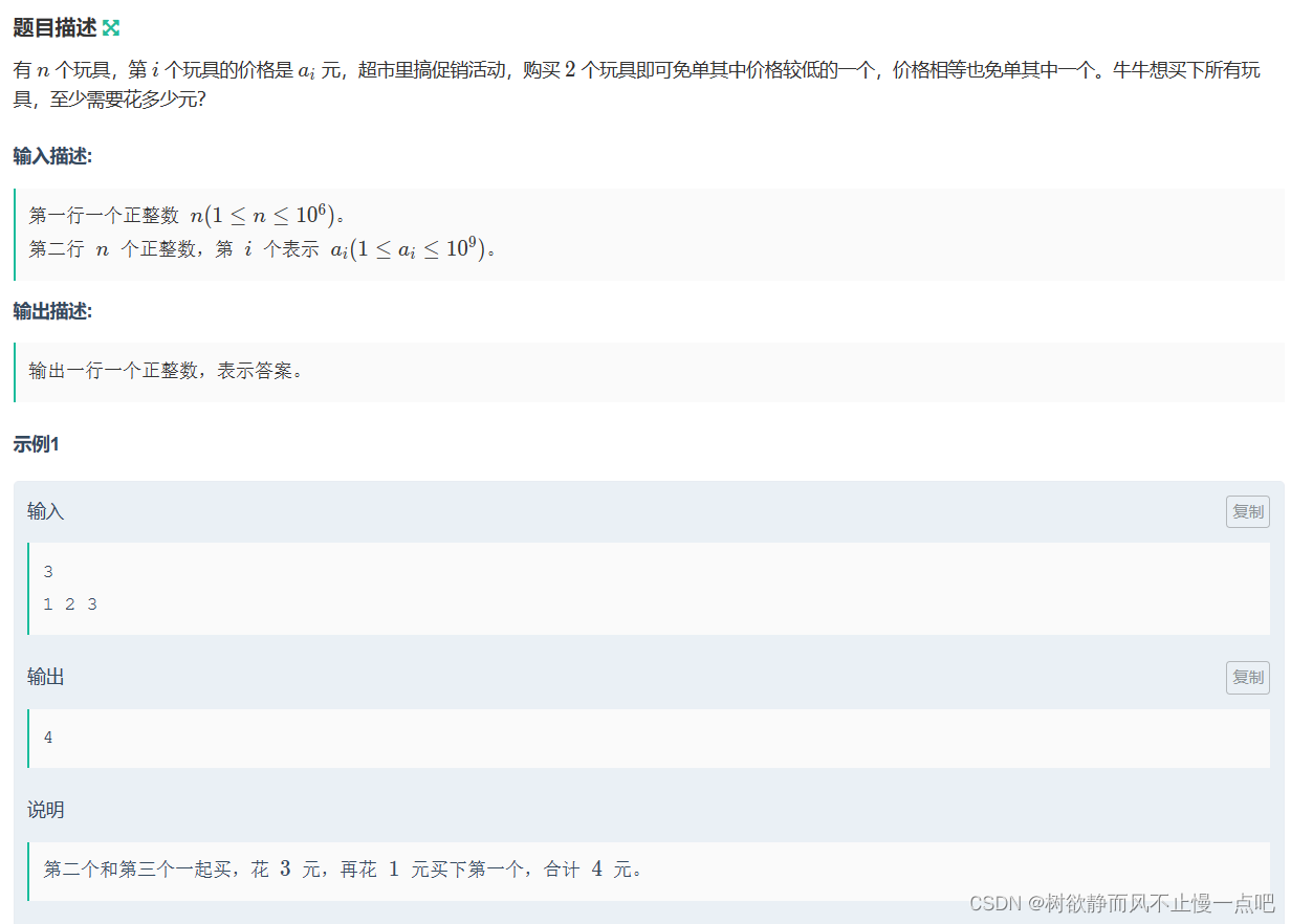 n=int(input()) a=list(map(int,input().split())) a.sort(reverse=True) print(sum(a[i] for i in range(0,n,2)))