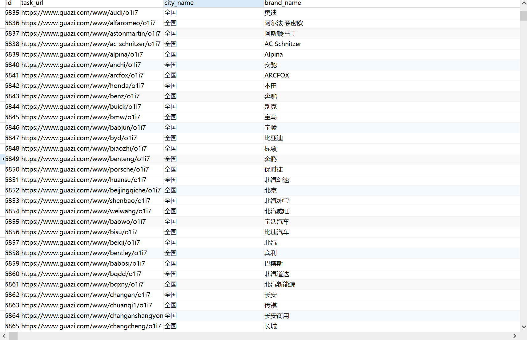只要破解了瓜子二手车的主页面,我们就可以使用mysql将其数据存入,在通过取出mysql的数据进行下一步爬取,