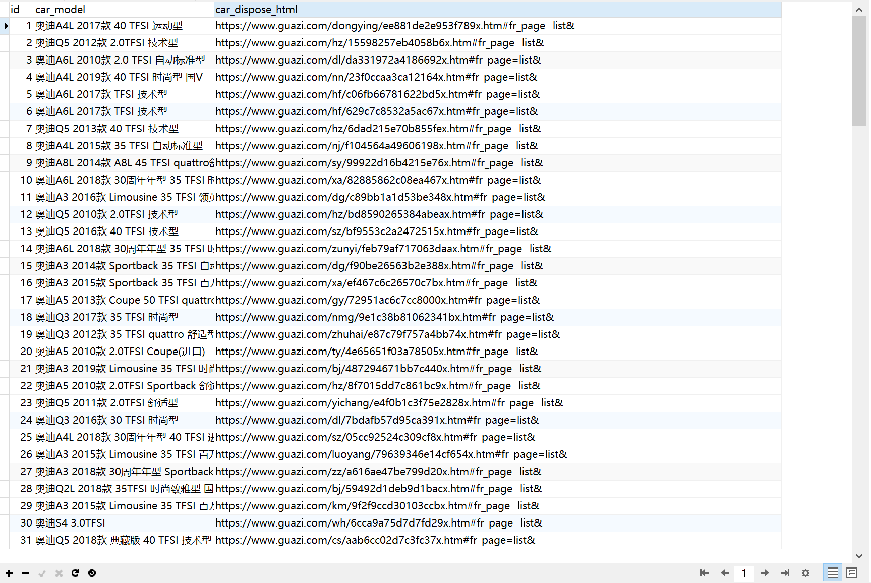 图为mysql的截图,这是在去全国范围里提取出奥迪的数据,数据包括标题和网址