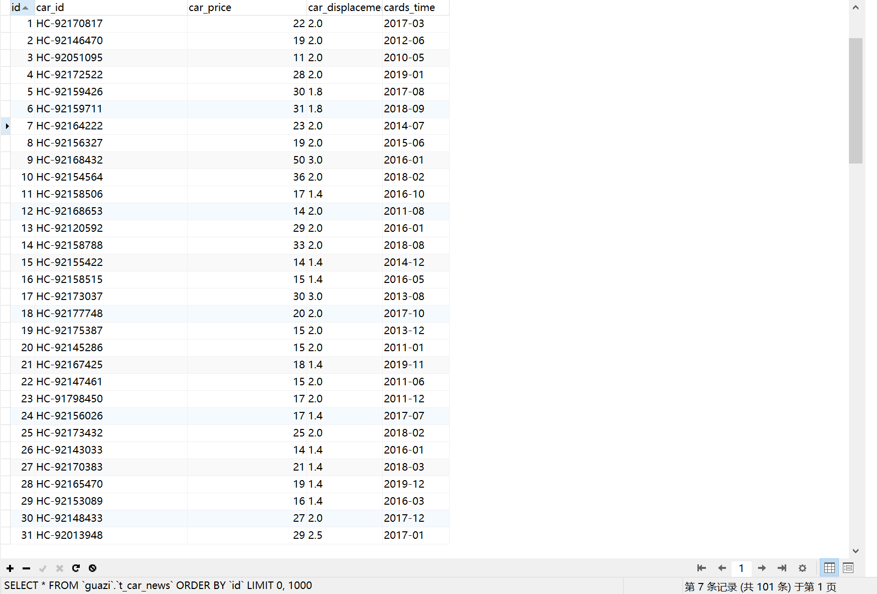 上面的表格是车辆的车源号,价钱,排量,上牌时间