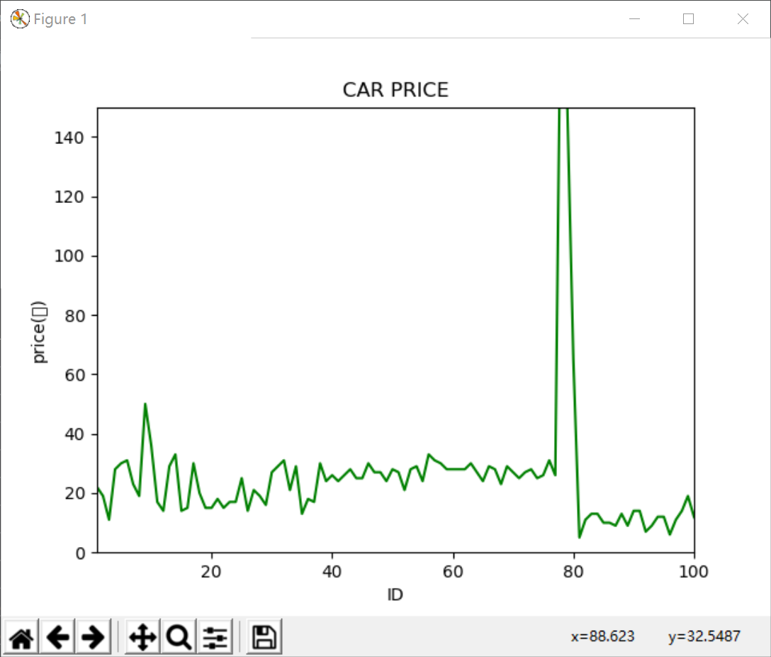 1 """ 2 这段代码我们把mysql中保存的车辆价格提取出来再绘制成图像 3 """ 4 import matplotlib.pyplot as plt 5 import pandas as pd 6 import pymysql 7 8 conn = pymysql.connect( 9 host="localhost", 10 port=3306, 11 user="root", 12 password="123456", 13 database="guazi", 14 charset="utf8") 15 16 data = pd.read_sql("SELECT car_price,id FROM t_car_news", con=conn) 17 18 y = list(data.car_price) 19 x = list(data.id) 20 21 plt.plot(x, y, "g-") 22 23 # 设置x坐标轴的范围 24 plt.xlim(1, 100) 25 # 设置y坐标轴的范围 26 plt.ylim(0, 150) 27 28 # 设置X轴文字的标题 29 plt.xlabel("ID") 30 # 设置Y轴文字的标题 31 plt.ylabel("price(万)") 32 33 # 设置图表的标题 34 plt.title("CAR PRICE") 35 36 plt.show() 37 # print(type(x)) 38 # 关闭数据库连接 39 conn.close()