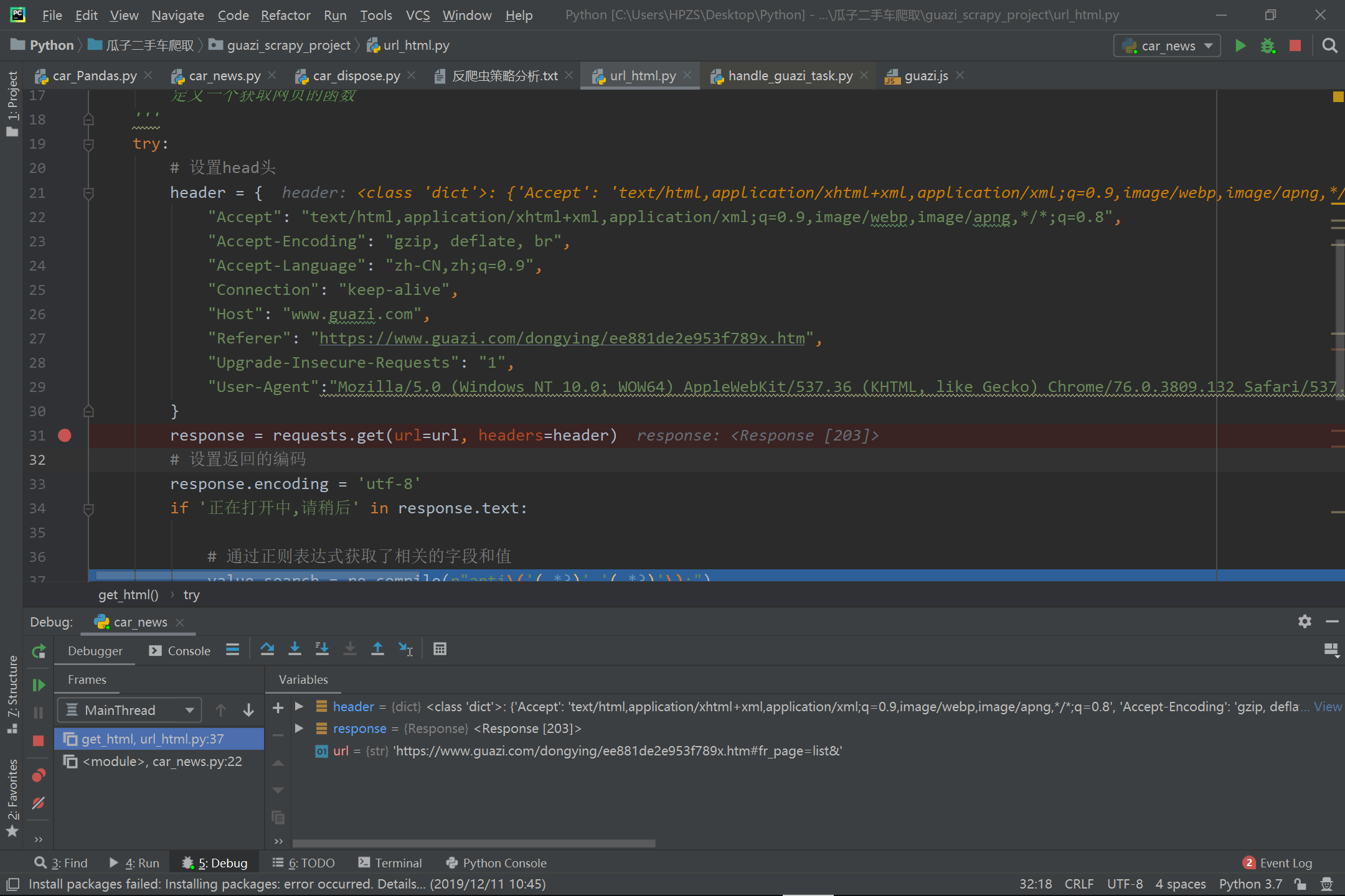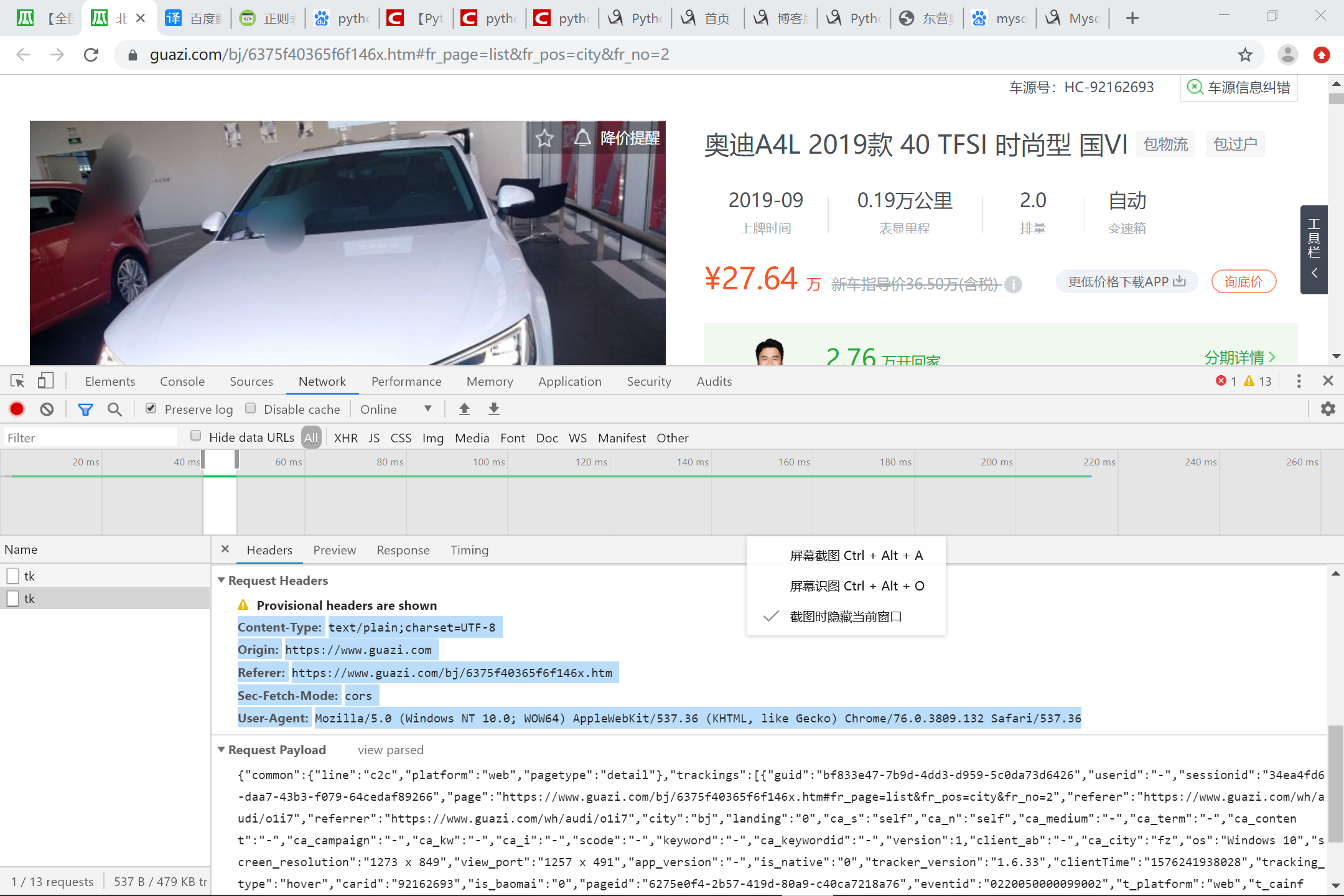 在这次爬虫的过程中,最大的难点在于破解瓜子二手车的反爬,