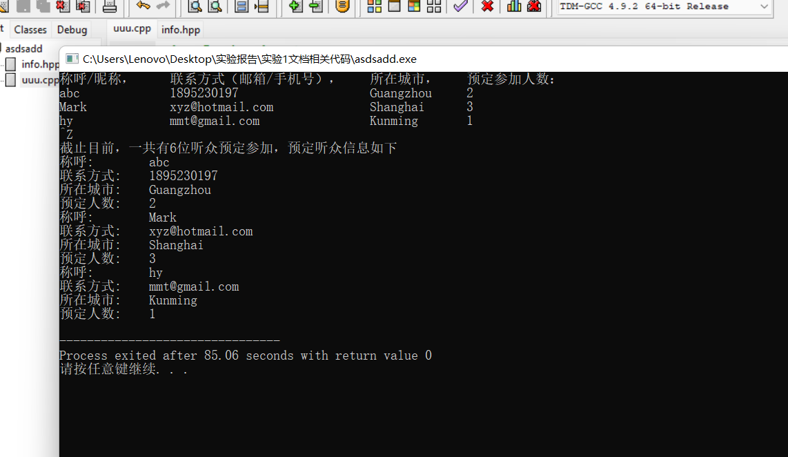 cout<<"称呼/昵称, 联系方式(邮箱/手机号), 所在城市, 预定参加人数:"<<endl;