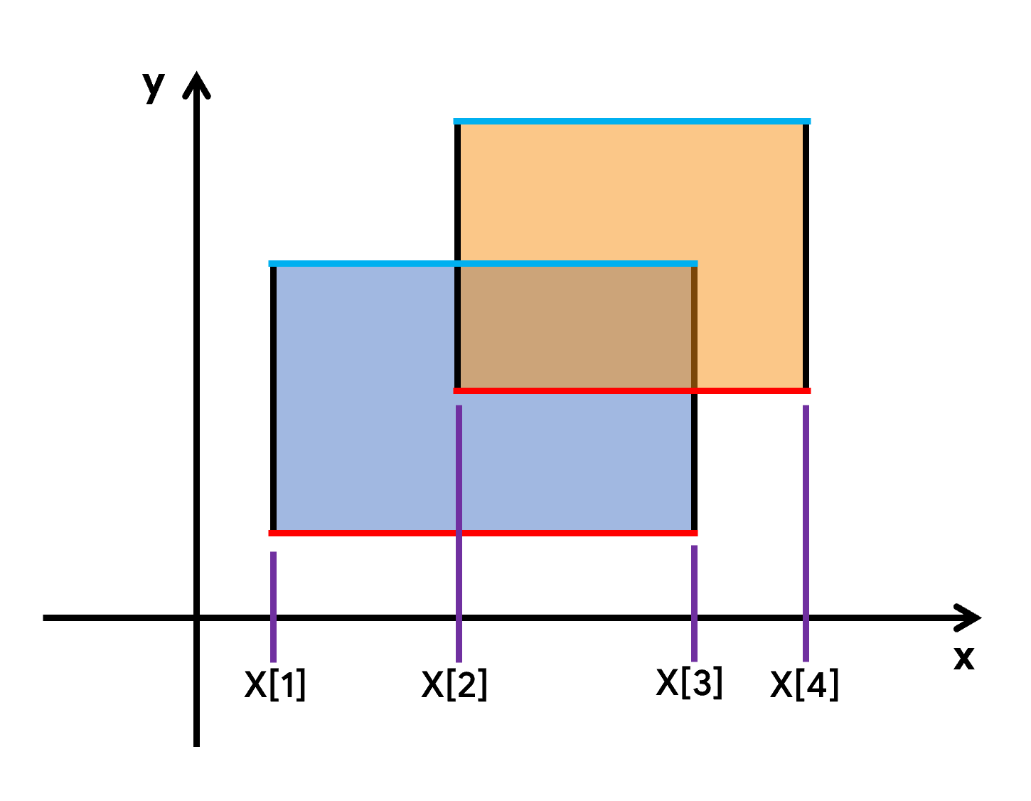 设想一条平行于\(x\)轴的扫描线从下往上扫过整个图形,根据矩形的面积求法,扫过面积等于当前扫到的区间长度\(*\)当前扫过的高度。