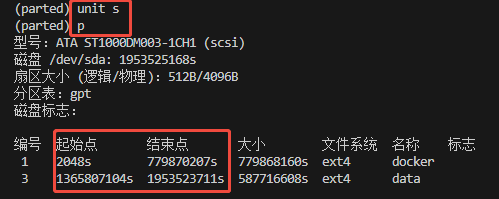 使用parted操作分区(/dev/sda是要操作的硬盘设备,sda1、2、3是分区)