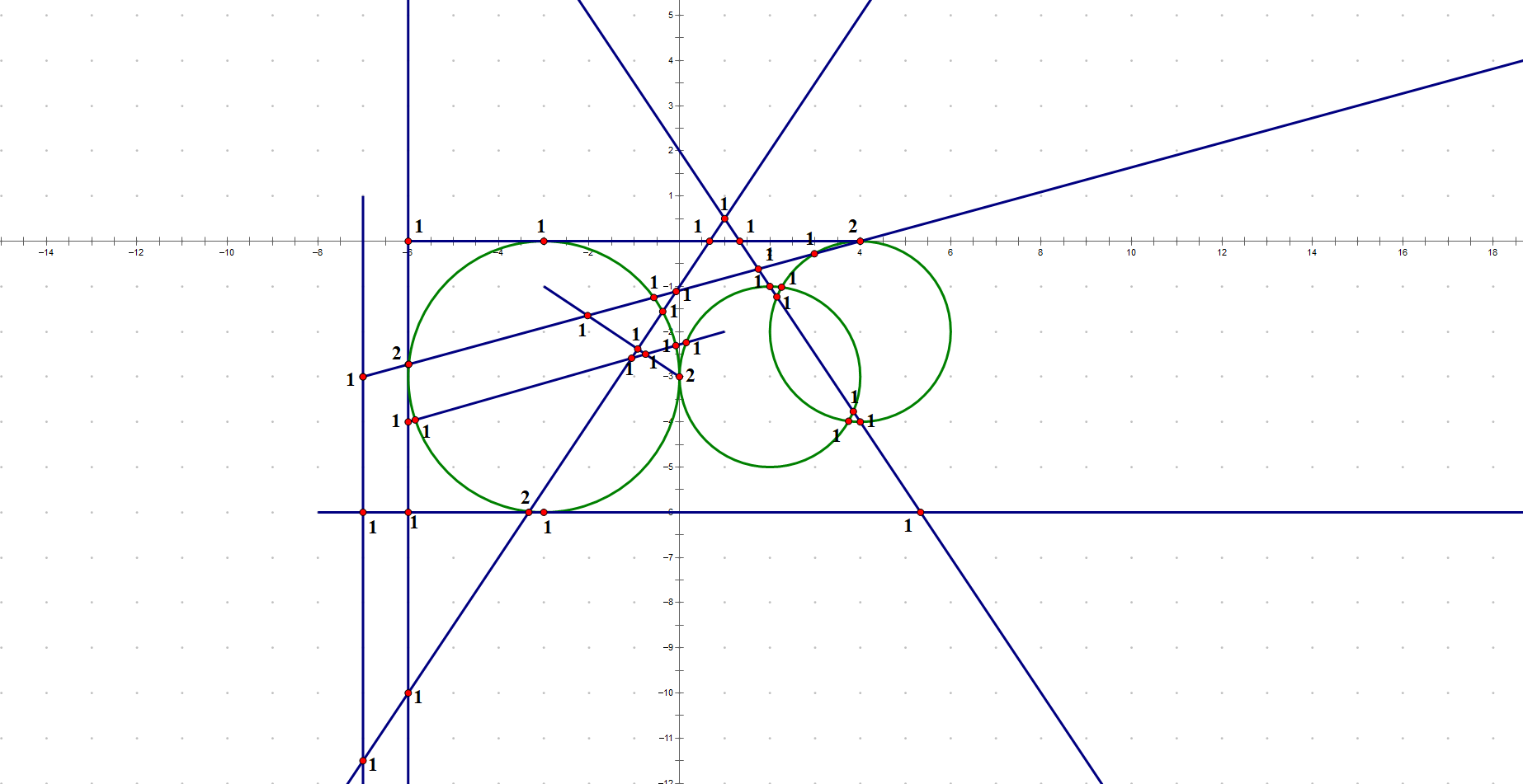 0 CNONE 1 SEGMENT (-3 , -1) (0 , -3) 3.60555 (0.83205 , -0.5547) 2 SEGMENT (-6 , 0) (4 , 0) 10 (1 , 0) 3 SEGMENT (-6 , -4) (1 , -2) 7.28011 (0.961524 , 0.274721) 4 RAY (-7 , 1) (0 , -1) 5 RAY (-7 , -3) (0.964764 , 0.263117) 6 RAY (-8 , -6) (1 , 0) 7 LINE (-4 , -7) (0.5547 , 0.83205) 8 LINE (-6 , -4) (0 , 1) 9 LINE (0 , 2) (0.5547 , -0.83205) 10 CIRCLE (-3 , -3) 3 11 CIRCLE (2 , -3) 2 12 CIRCLE (4 , -2) 2 ( -7 , -11.5 ) 4 7 INTX ( -7 , -6 ) 4 6 INTX ( -7 , -3 ) 4 5 INTX ( -6 , -10 ) 7 8 INTX ( -6 , -6 ) 6 8 INTX ( -6 , -4 ) 3 8 INTX ( -6 , -3 ) 8 10 INTX ( -6 , -2.72727 ) 5 8 INTX ( -6 , 0 ) 2 8 INTX ( -6 , 11 ) 8 9 INTX ( -5.98726 , -2.7238 ) 5 10 INTX ( -5.84381 , -3.95537 ) 3 10 INTX ( -3.33333 , -6 ) 6 7 INTX ( -3.32179 , -5.98269 ) 7 10 INTX ( -3 , -6 ) 6 10 INTX ( -3 , 0 ) 2 10 INTX ( -2.03226 , -1.64516 ) 1 5 INTX ( -1.05882 , -2.58824 ) 3 7 INTX ( -0.923077 , -2.38462 ) 1 7 INTX ( -0.75 , -2.5 ) 1 3 INTX ( -0.566588 , -1.24543 ) 5 10 INTX ( -0.370513 , -1.55577 ) 7 10 INTX ( -0.0807176 , -2.30878 ) 3 10 INTX ( -0.0740741 , -1.11111 ) 5 7 INTX ( 0 , -3 ) 1 11 INTX ( 0 , -3 ) 10 11 INTX ( 4.44089e-16 , -3 ) 1 10 INTX ( 0.148704 , -2.24323 ) 3 11 INTX ( 0.666667 , 0 ) 2 7 INTX ( 1 , 0.5 ) 7 9 INTX ( 1.33333 , 0 ) 2 9 INTX ( 1.74359 , -0.615385 ) 5 9 INTX ( 2 , -1 ) 9 11 INTX ( 2.15385 , -1.23077 ) 9 12 INTX ( 2.25838 , -3.98324 ) 11 12 INTX ( 2.98462 , -0.276923 ) 5 12 INTX ( 3.74162 , -1.01676 ) 11 12 INTX ( 3.84615 , -3.76923 ) 9 11 INTX ( 4 , -4 ) 9 12 INTX ( 4 , -1.77636e-15 ) 5 12 INTX ( 4 , 0 ) 2 5 INTX ( 4 , 0 ) 2 12 INTX ( 5.33333 , -6 ) 6 9 INTX 43 ( -7 , -11.5 ) 4 7 INTX ( -7 , -6 ) 4 6 INTX ( -7 , -3 ) 4 5 INTX ( -6 , -10 ) 7 8 INTX ( -6 , -6 ) 6 8 INTX ( -6 , -4 ) 3 8 INTX ( -6 , -3 ) 8 10 INTX ( -6 , -2.72727 ) 5 8 INTX ( -6 , 0 ) 2 8 INTX ( -6 , 11 ) 8 9 INTX ( -5.98726 , -2.7238 ) 5 10 INTX ( -5.84381 , -3.95537 ) 3 10 INTX ( -3.33333 , -6 ) 6 7 INTX ( -3.32179 , -5.98269 ) 7 10 INTX ( -3 , -6 ) 6 10 INTX ( -3 , 0 ) 2 10 INTX ( -2.03226 , -1.64516 ) 1 5 INTX ( -1.05882 , -2.58824 ) 3 7 INTX ( -0.923077 , -2.38462 ) 1 7 INTX ( -0.75 , -2.5 ) 1 3 INTX ( -0.566588 , -1.24543 ) 5 10 INTX ( -0.370513 , -1.55577 ) 7 10 INTX ( -0.0807176 , -2.30878 ) 3 10 INTX ( -0.0740741 , -1.11111 ) 5 7 INTX ( 4.44089e-16 , -3 ) 1 10 INTX ( 0 , -3 ) 1 11 INTX ( 0 , -3 ) 10 11 INTX ( 0.148704 , -2.24323 ) 3 11 INTX ( 0.666667 , 0 ) 2 7 INTX ( 1 , 0.5 ) 7 9 INTX ( 1.33333 , 0 ) 2 9 INTX ( 1.74359 , -0.615385 ) 5 9 INTX ( 2.15385 , -1.23077 ) 9 12 INTX ( 2.25838 , -3.98324 ) 11 12 INTX ( 2.98462 , -0.276923 ) 5 12 INTX ( 3.74162 , -1.01676 ) 11 12 INTX ( 3.84615 , -3.76923 ) 9 11 INTX ( 4 , 0 ) 2 5 INTX ( 4 , -4 ) 9 12 INTX ( 4 , 0 ) 2 12 INTX ( 4 , -1.77636e-15 ) 5 12 INTX ( 5.33333 , -6 ) 6 9 INTX 43 43