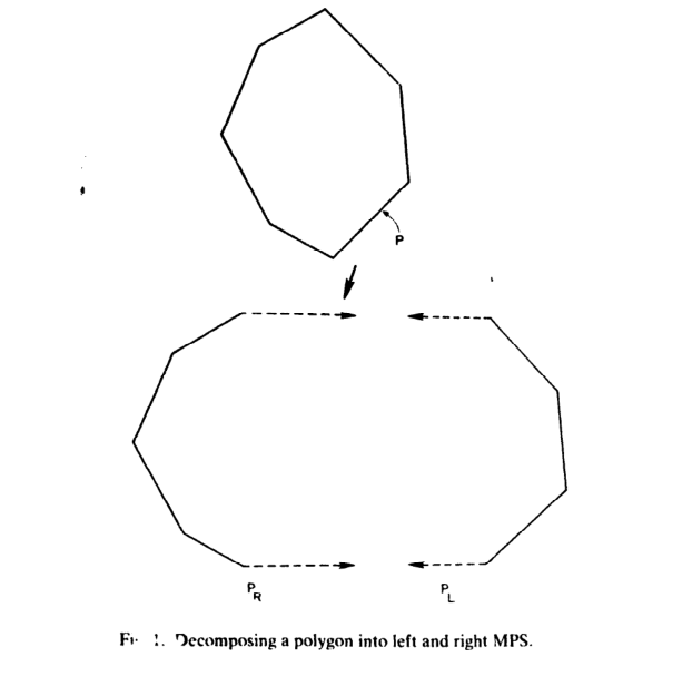 在多边形边界的最高和最低y坐标处进行切割,将多边形边界分解为两个单调的多边形边链,按照y坐标递增的方向确定这两条链的角和边的顺序。由于是凸多边形,这样的两条链的方向一定是左向或者右向(图中的PR和PL,注意不是在左边的为R在右边的为L,而是左向的为L,右向的为R),在每条链的头和尾分别加上一条水平的无穷射线(如果是PR则是指向x轴正无穷,如果是PL则指向负无穷),这样每条链就组成了monotone polygonal sectors (MPS). 单调多边形扇区。