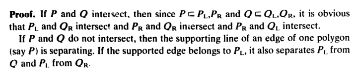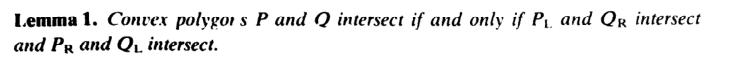 引理1 : 凸多边形P和Q相交当且仅当 PL 和 QR相交且 PR和QL相交。