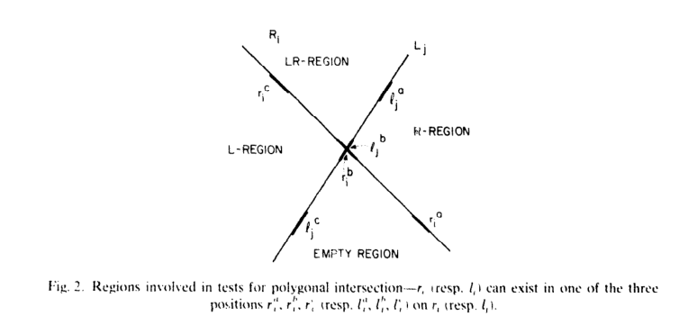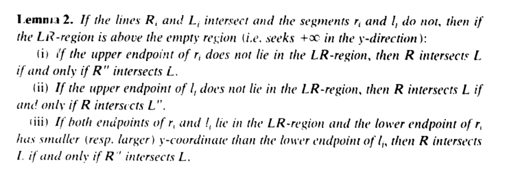每次迭代都会选取i=[m/2]和j=[n/2]的边ri和lj进行考虑。设Ri和Lj是ri和lj所构成直线,那么这两条相交直线可以把空间分成R、LR、L和EMPTY四个区域(如果直线平行则是退化情况,因为凸性质R和L都会被限制在直线的一个半平面内,只需考虑R和L所在的两个半平面是否有交集即可)。其中R和L只能占据这四个区域中的其中两个区域(由于凸性质,R只会在ri这条边的右边区域(LR和R),L只会在lj这条边的左边区域(LR和L)),而此次迭代裁剪掉一半的边后,剩下的R和L存在于其中的某个区域。新的MPS(R',R''和L',L'')怎么保留由下面引理决定,其中R''是穿过ri端点的水平射线的R的上半部分,R'是下半部分。(L'和L''同理)。
