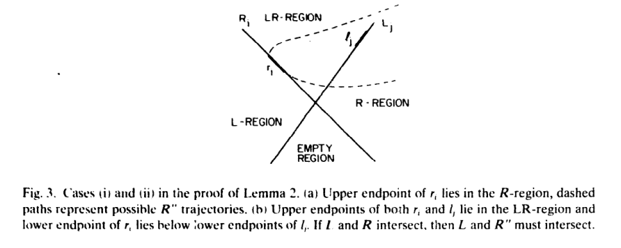 总结就是说,如Fig.2所示,ri和lj的位置总共有3*3=9种情况,无论是哪一种情况,都可以归结到引理2的三种情况中,如果有其中一条边的端点不在LR区域,则可以舍弃与EMPTY区域相邻的那一半的链;如果两条边的端点都在LR区域,则可以舍弃两条链中离LR区域最远的那一半的链。