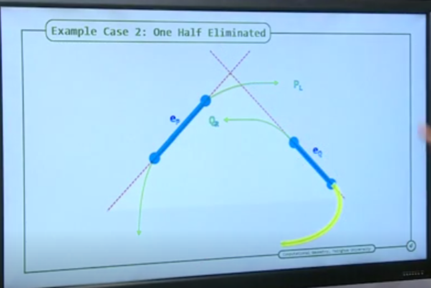 构造出两个MPS后,剩下的问题就是利用二分搜索找出链相交的边。在每次二分迭代中,选择每个链的一条边(一般是最中间的边mid edge)所在的直线构成支撑线。利用两条支撑线的交点提供的信息(基于MPS的属性)允许我们每次迭代都可以忽略一个(或两个)多边形的一半的边,而且不会错过交点的检测。原始的边不会被删除,只是原始的结构信息会被丢弃,并且每次迭代会构造新的水平射线边缘来保持MPS的属性。下面通过一个简单的例子来说明,迭代后新组成的链相交当且仅当原来的链相交。