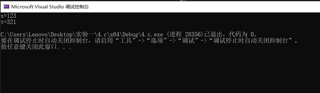 #include<stdio.h> int main() { int x, t, m; x = 123; printf("x=%d\n", x); t = 0; m = x % 10; t = t * 10 + m; x = x / 10; m = x % 10; t = t * 10 + m; x = x / 10; m = x % 10; t = t * 10 + m; x = x / 10; printf("t=%d\n", t); return 0; }