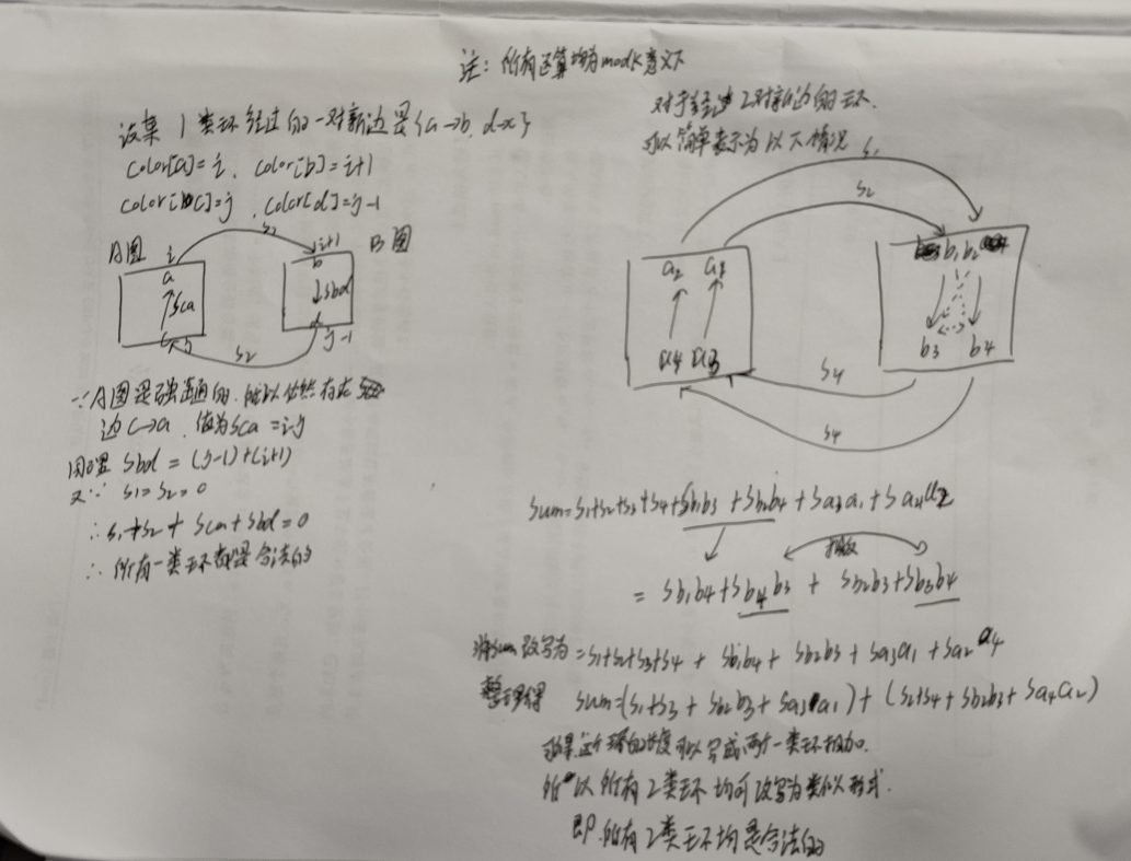 如果一个环经过了A类边,那么必然要再经过B类边回来,不然不可能形成回路