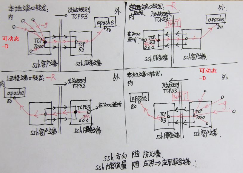 草图中 红色箭头是真实流量的方向,黑色箭头是ssh连接的方向