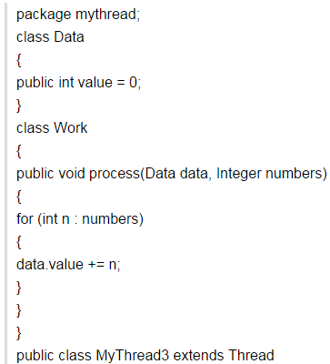 上面讨论的两种向线程中传递数据的方法是最常用的。但这两种方法都是main方法中主动将数据传入线程类的。这对于线程来说,是被动接收这些数据的。然而,在有些应用中需要在线程运行的过程中动态地获取数据,如在下面代码的run方法中产生了3个随机数,然后通过Work类的process方法求这三个随机数的和,并通过Data类的value将结果返回。从这个例子可以看出,在返回value之前,必须要得到三个随机数。也就是说,这个 value是无法事先就传入线程类的。