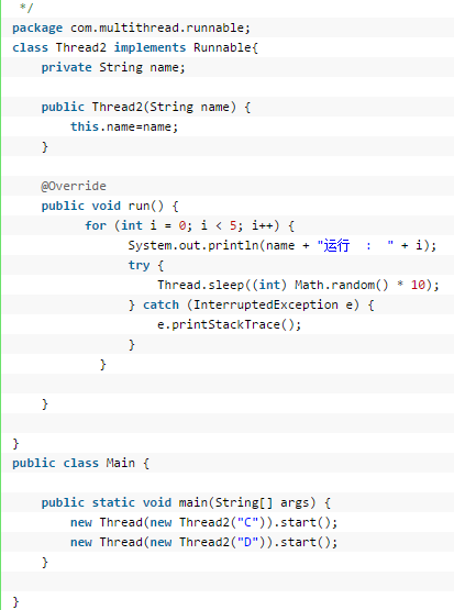 Thread2类通过实现Runnable接口,使得该类有了多线程类的特征。run()方法是多线程程序的一个约定。所有的多线程代码都在run方法里面。Thread类实际上也是实现了Runnable接口的类。