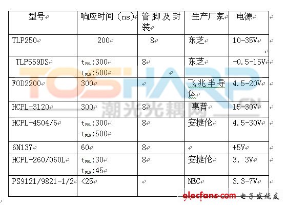 光电耦合器应用于开关电源的控制信号传输与隔离,最主要考虑的是其响应速度能否满足要求。设开关频率为100KHz,则开关周期为10us, 光电耦合器传输延迟初步限定在500ns①以内,查阅目前市场上光电耦合器器件的技术资料,能满足这一要求的产品主要有: