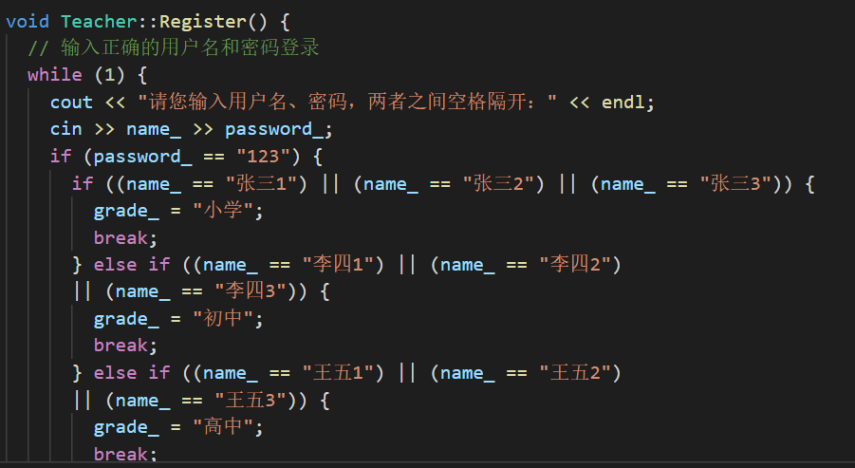 (1)if-else语句实现对登录用户用户名和密码的匹配确认,逻辑简单,便于理解。经检验,功能正常;