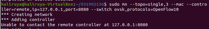 - 终端输入 sudo mn --topo=single,3 --mac --controller=remote,ip=127.0.0.1,port=6633 --switch ovsk,protocols=OpenFlow10 搭建图示拓扑